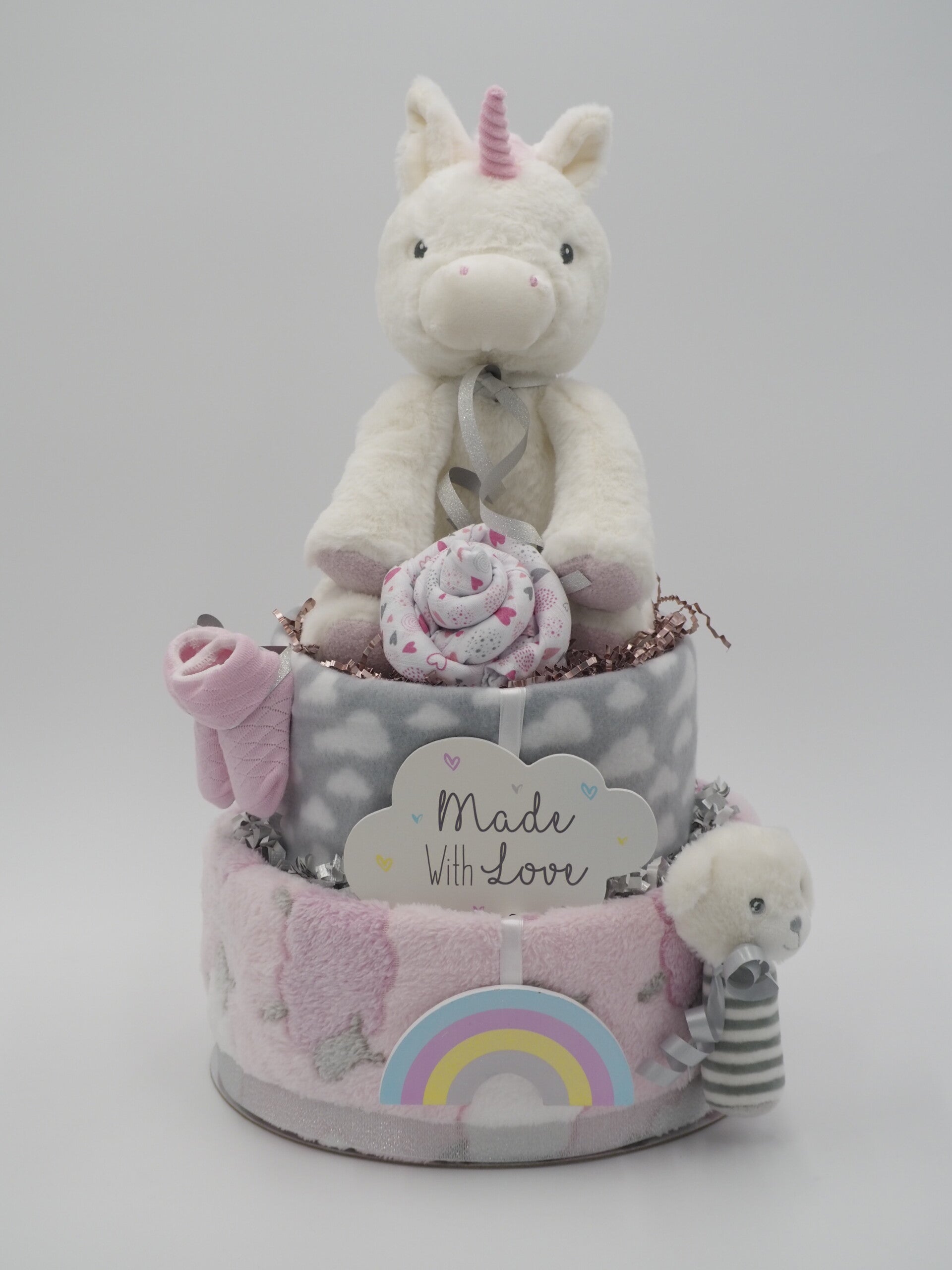 De twee-laags luiertaart met roze schapenprint is een schattige en praktische keuze voor ouders die op zoek zijn naar een uniek en functioneel cadeau. Deze prachtige luiertaart is zorgvuldig met de hand gemaakt en straalt een lieflijke charme uit met zijn roze/grijze kleur en schapenprint design. Of je nu op zoek bent naar een cadeau voor een babyshower, kraambezoek of gewoon een attentie voor nieuwe ouders, deze luiertaart zal zeker in de smaak vallen.